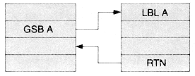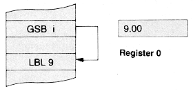 A GSB instruction followed by a label designator (0 through 9 or i) branches program execution to the label specified just as a GTO instruction does. But, using the GSB instruction, program execution is then "returned" automatically to the step following the GSB instruction when the next RTN (Return) instruction is executed (see following illustration).