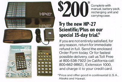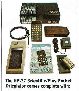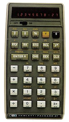 The HP-27 gives you all the most-used exponential, log and trig functions-including sines, cosines, tangents and their inverses in three angular modes; natural and common logs and anti-logs; pi; related arithmetic functions; coordinate conversions; angle conversion, angle addition and subtraction.