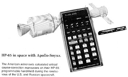 The American astronauts calculated critical course-correction maneuvers on their HP-65 programmable hand-held during the rendezvous of the U.S. and Russian spacecraft.