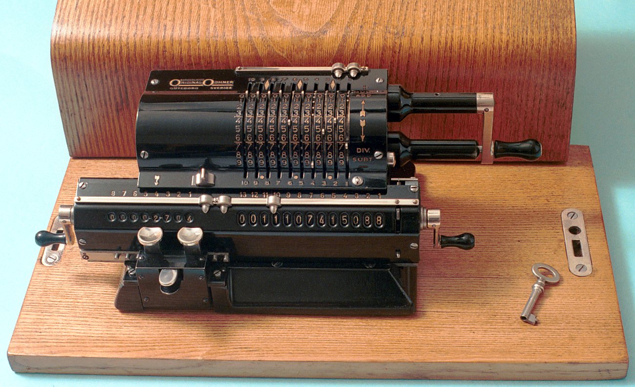 Picture of an Original Odhner pinwheel calculator laying on its base