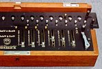 The sliding levers in the middle set the number to be added and these had windows next to them to show the number at a glance. The little levers in front of the number levers were another "modern" improvement which allowed for quick clearing. Lifting one of these levers set all numbers to the right of that lever to zero. Depressing one of them set all numbers to the left to zero.