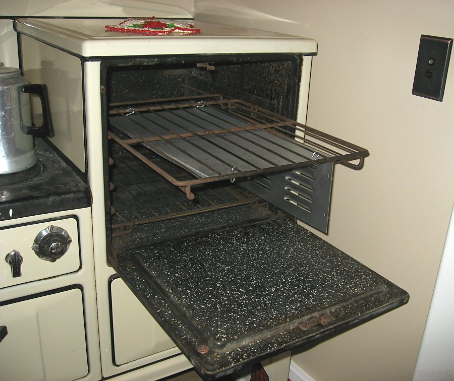 The oscillator was painted in the garage and then the paint was baked on using the oven in the kitchen. There's a cover in the "baking position" below. Bill and Dave later made an oven of their own out of an broken refrigerator but soon learned that the insulation used in the refrigerator was flammable! Everyone lived to a healthy old age despite all the paint baking in the kitchen.