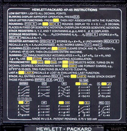 Unlike the HP-35, this calculator had no "clear the entire machine" button. However, its back plate points out that you can clear everything by turning the machine off and then on.