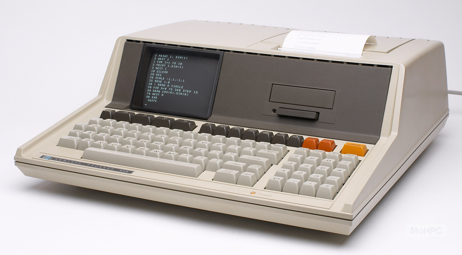 The first to be introduced and apparently the most popular of the series, this model featured a crisp built-in 6" B&W CRT that displayed 16 rows of 32 characters or 256x192 pixels in graphics mode. It also had a thermal printer and a tape drive. A touch of a key could copy anything from the HP-85's display to its printer.