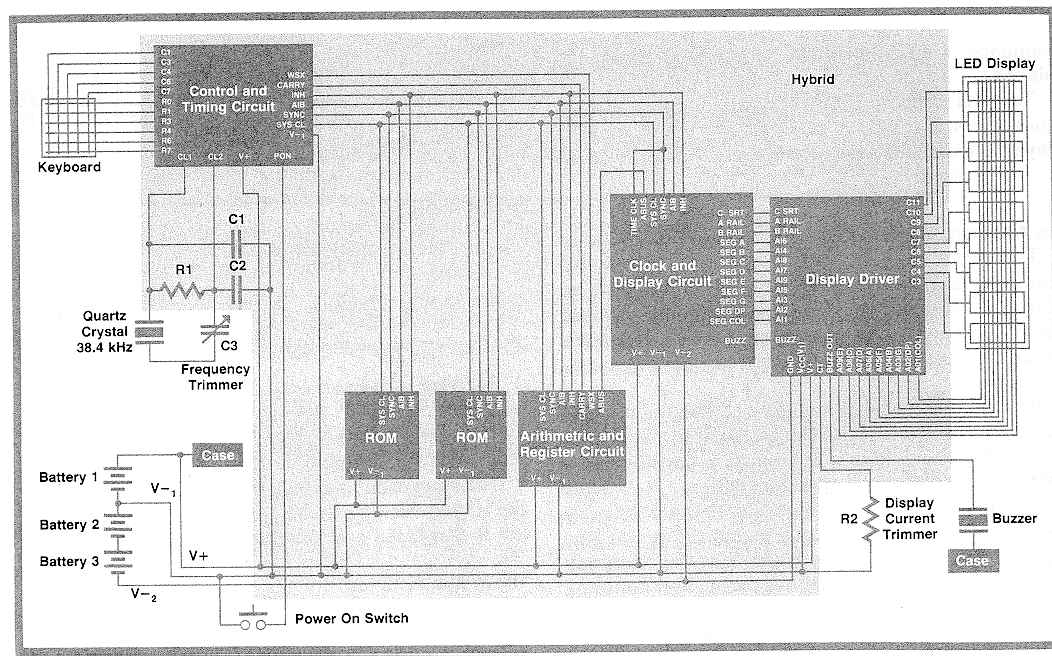 The HP-01 contains five CMOS/LSI* circuits: two read-only memories (ROMs), an arithmetic and register circuit, a control and timing circuit, and a clock and display circuit. One custom bipolar circuit drives the light-emitting diode anodes and cathodes. Fig. 1 is a block diagram of the HP-01.