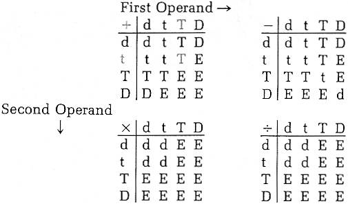 Since all four types of data can be used in arithmetic calculations, some rules have been established that define the data type of a result, given the types of the operands. These rules are summarized in the following table. D stands for date data, t stands for time interval data, T stands for time-of-day data, d stands for decimal data, and E stands for error. For example, when a time of day (T) is added to a time interval (t), the result is a time of day (T). The entries for this example are shown in gray in the table.