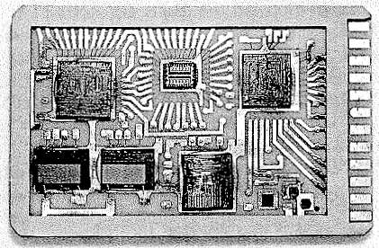 Fig. 2. All of the integrated circuits and three discrete components for the oscillator are combined in a hybrid circuit on a five-layer ceramic substrate.