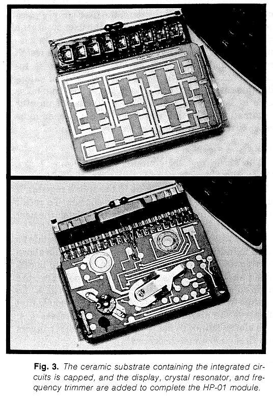 CIRCUITRY: The HP-01 uses six large-scale integrated circuits equivalent to 38,000 transistors. The nine-digit display is bonded to a five-layer ceramic module which contains the circuits.