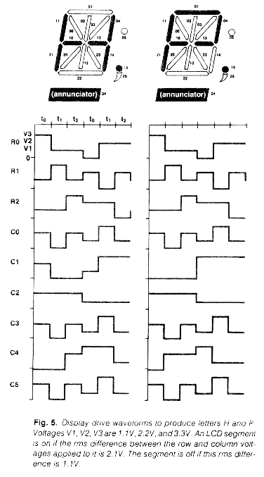 The display is multiplexed three ways by scanning the three row lines on the backplane of the LCD and presenting the column information in parallel to all characters. An LCD segment is considered on when the rms voltage difference between that row and that column exceeds a certain on threshold, and off if this voltage difference is below a certain off threshold. The drive waveforms use a four-level scheme that provides optimum on and off rms voltage differences of 2.1V and 1.1V, respectively. Fig. 5 shows the drive waveforms required to produce letters H and P. The rms values are computed by averaging the squares of the row-column differences over the six time periods shown. In letter P, for example, segment 14 sees an rms voltage difference between row 1 and column 4 of:
