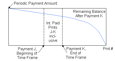This program finds both the total interest paid over a specified number of payment periods and the remaining balance at the end of the last specified period, given the periodic interest rate, periodic payment amount, loan amount, and the beginning and ending payment numbers for the time span being considered. The payments associated with both the beginning (J) and the ending (K) payment period are included in the calculation.