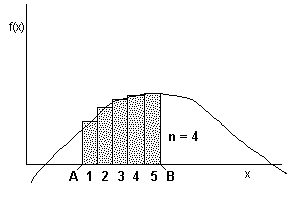 You specify the end points of the interval (a and b) and the number of rectangles (n) the interval should be broken into (see figure above). The calculator computes the sum of the areas of the rectangles. The more rectangles used the closer this value is to the actual area under the curve. However, more rectangles mean more computation time. Experience with a particular function should lead to a balance between accuracy and execution time.
