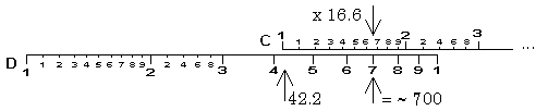 Picture of 42.2 x 16.6 = 700 on a K&E 20" rule (~40K)