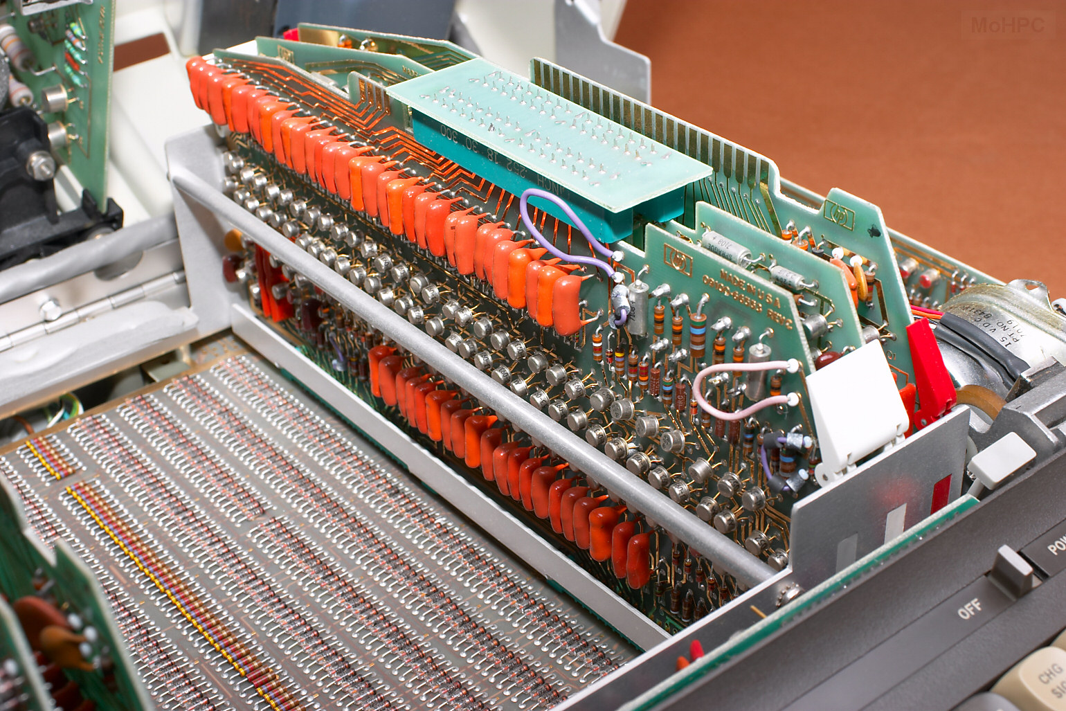 The CPU worked on a digit (nibble) serial basis. Each digit of a Binary Coded Decimal (BCD) number was fetched and operated on successively. The machine used a 1.21MHz clock. The hard-wired logic gates were created with diode-resistor logic. To keep the huge board (which also served as the motherboard) as simple as possible, all diodes were oriented the same way and most resistors had the same value. All interconnections were made on 6 internal layers making the board almost immune to solder bridges and other shorts. Plugged into this board were boards containing 40 flip flops, a board containing control logic, the core memory board, and the core sense amplifier board.