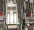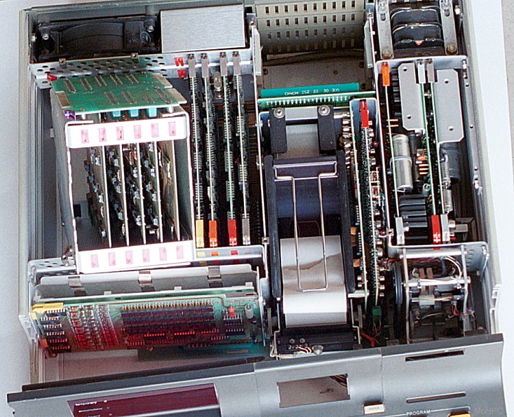 The HP 9800 series used heavy duty sheet metal cases. These were lighter (though not as strong) as the HP 9100. Because of the denser packaging and greater speed (and therefore heat), a fan was added. All boards (even the power supply) plugged into edge connectors. The card ejectors were color coded to match the colored slot guides to eliminate assembly errors.