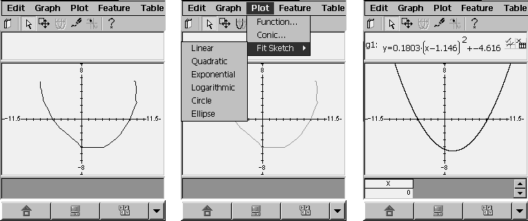 The graph environment's most interesting feature was direct manipulation. The user could draw a graph with the pencil tool and then have the Xpander fit the best mathematical formula to that curve and redraw the graph to that formula as shown in this sequence: