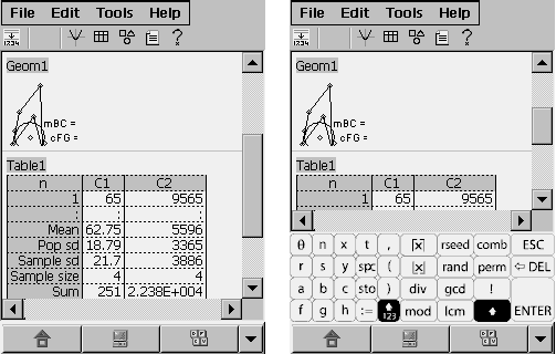 The table environment was essentially a spreadsheet for statistics. Any number of rows and columns of data could be entered in the table pane, and statistics were continuously updated in the statistics pane. Statistics were: Mean, Population Standard Deviation, Sample Standard Deviation, Sample Size, Sum, Minimum, 1st Quartile, Median, 3rd Quartile and Maximum.